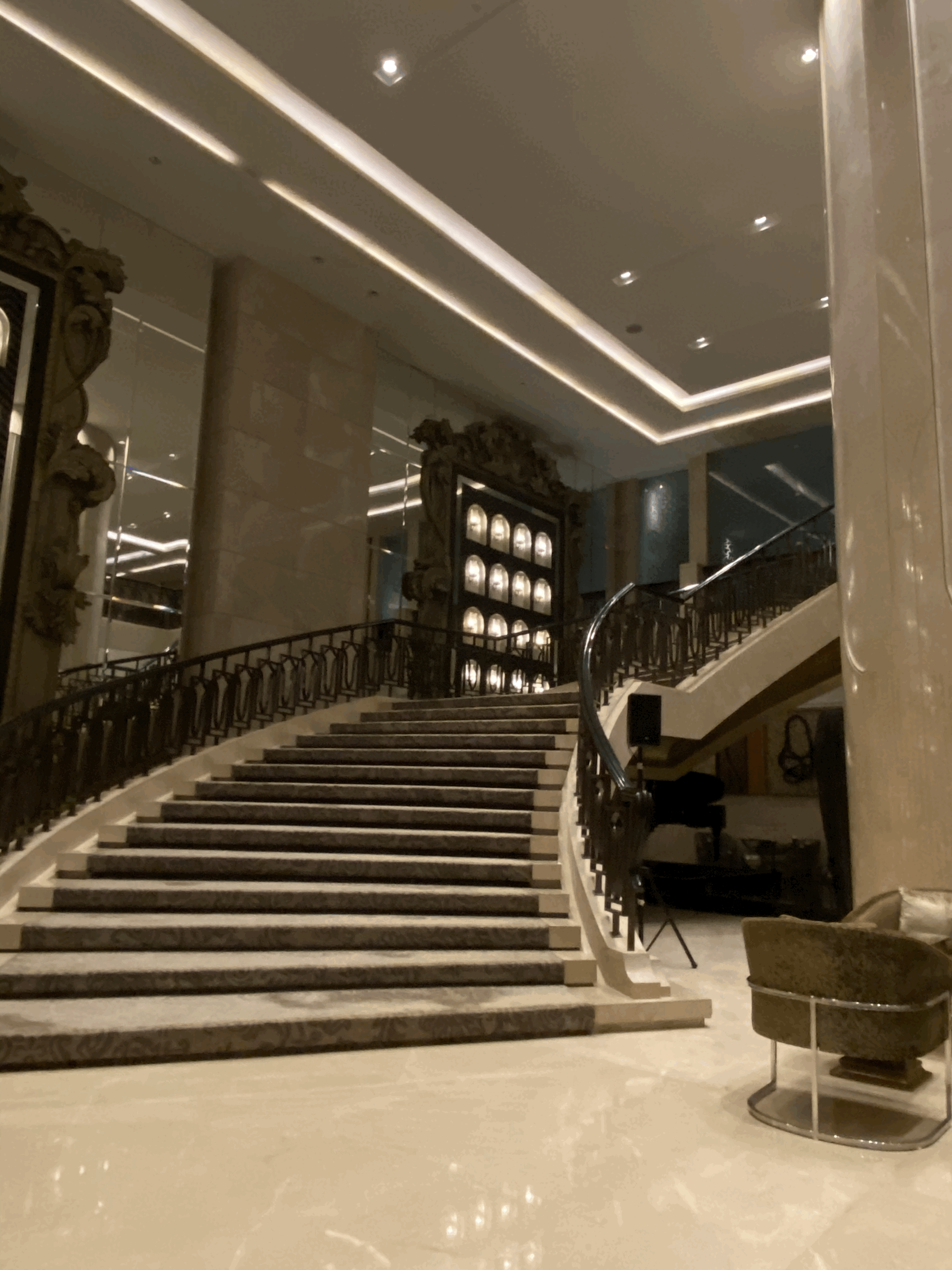 The hotel itself looks grand. The driveway entry seems posh, and the lobby gives you a quintessential five-star feeling. The prominent attraction - the central stairs where they sabre champagne every week - but more on this later.